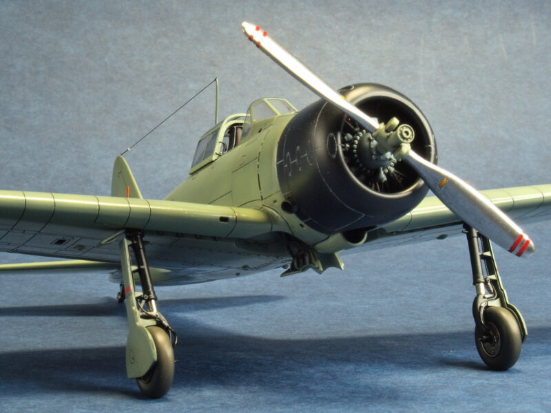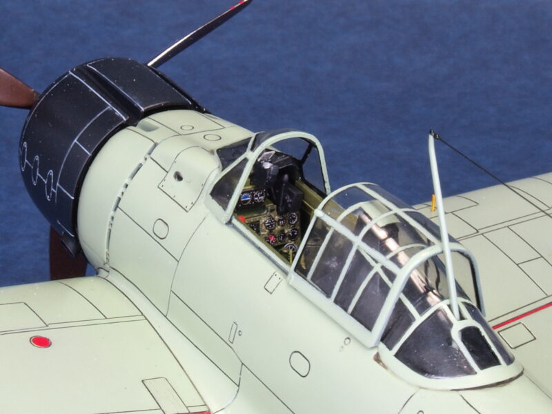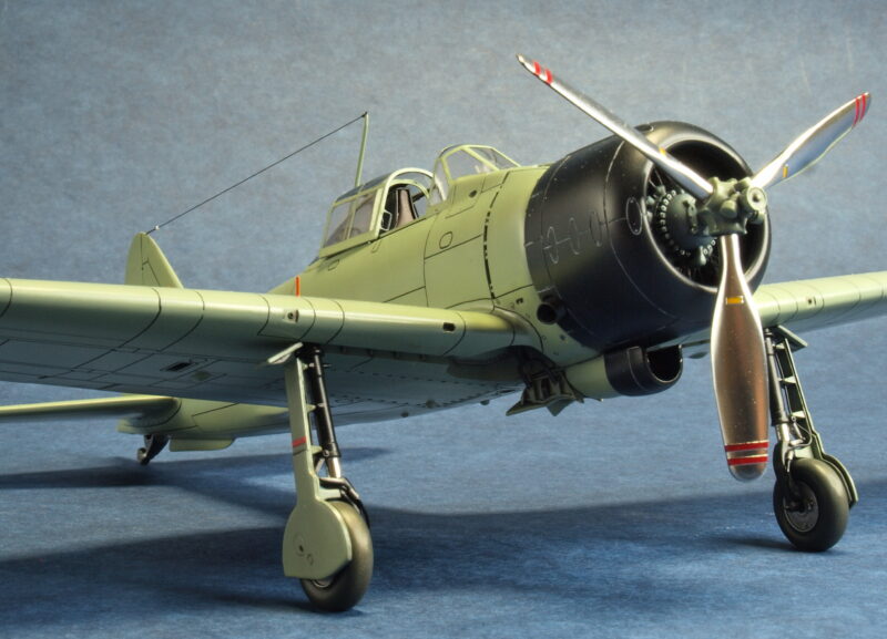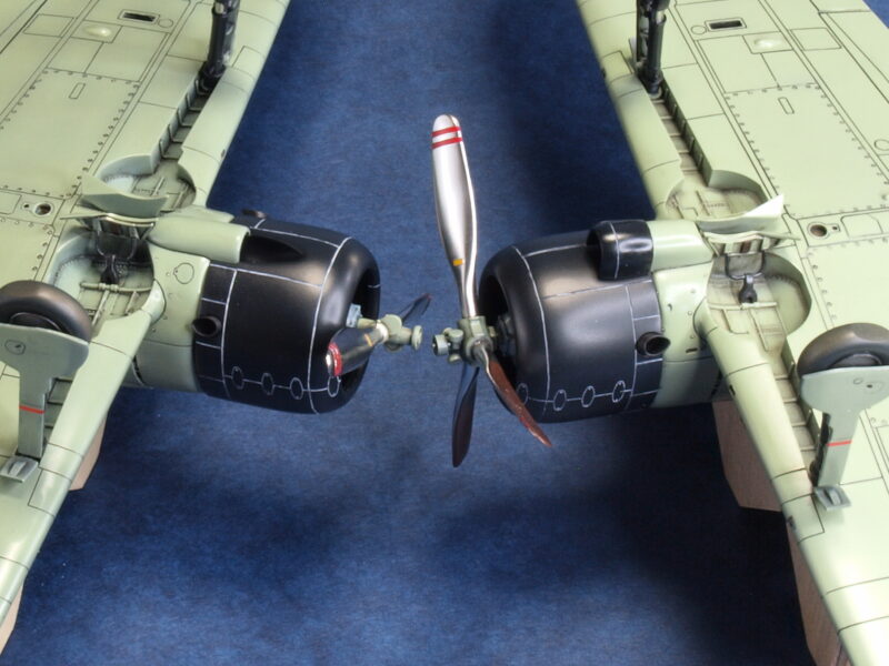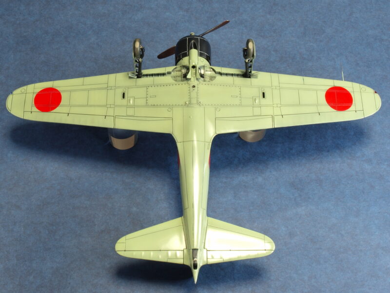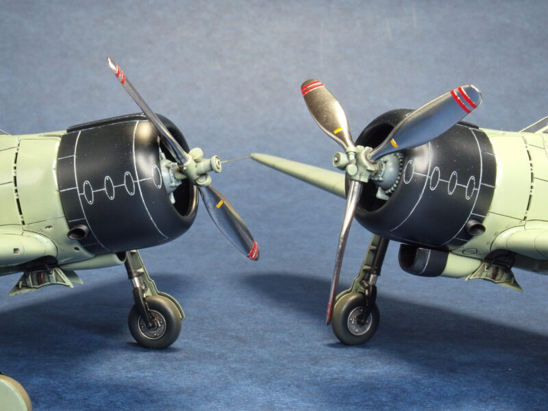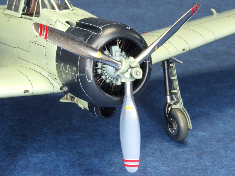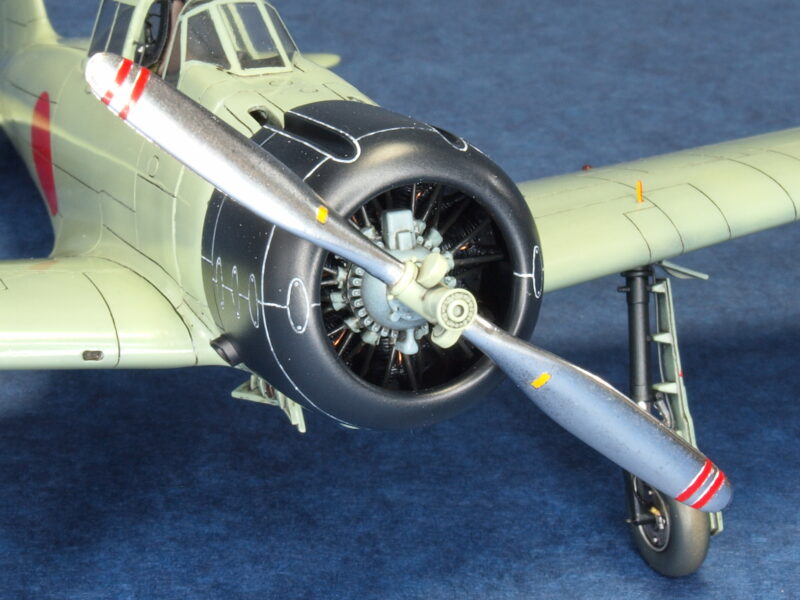 試作一号機と試作二号機の発動機は、三菱製の「瑞星」です。キット発動機パーツではプッシュロッドが省略されているので、その再現と点火プラグ配線を追加しています。2枚プロペラは、試作一号機の初飛行時に装着されていましたが、発動機の振動トラブルが解決しないため、3枚プロペラに換装されます。試作二号機も、この改修結果を受けて3枚プロペラに換装されて海軍に領収されています。本作品のプロペラは、発動機パーツ内にネオジム磁石を仕込んで、マグネット式脱着化の加工を行っています。因みに本作品の試作二号機の3枚プロペラは、アカデミー製1/48スケールの零戦21型からトレード流用しています。