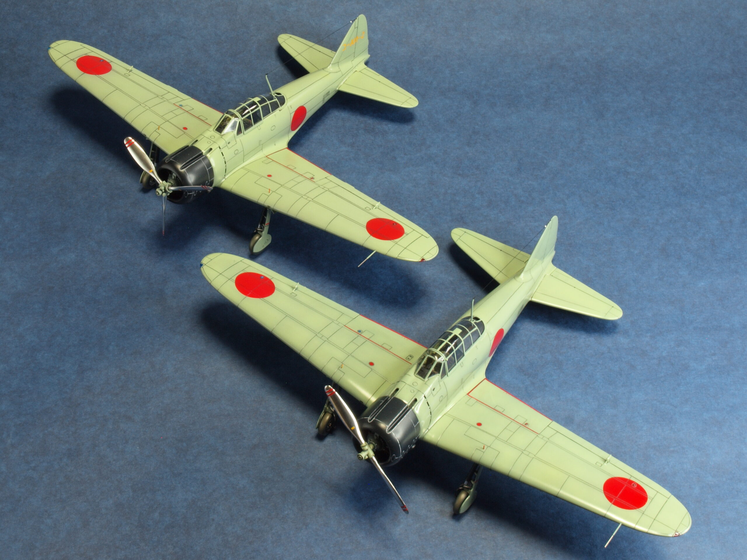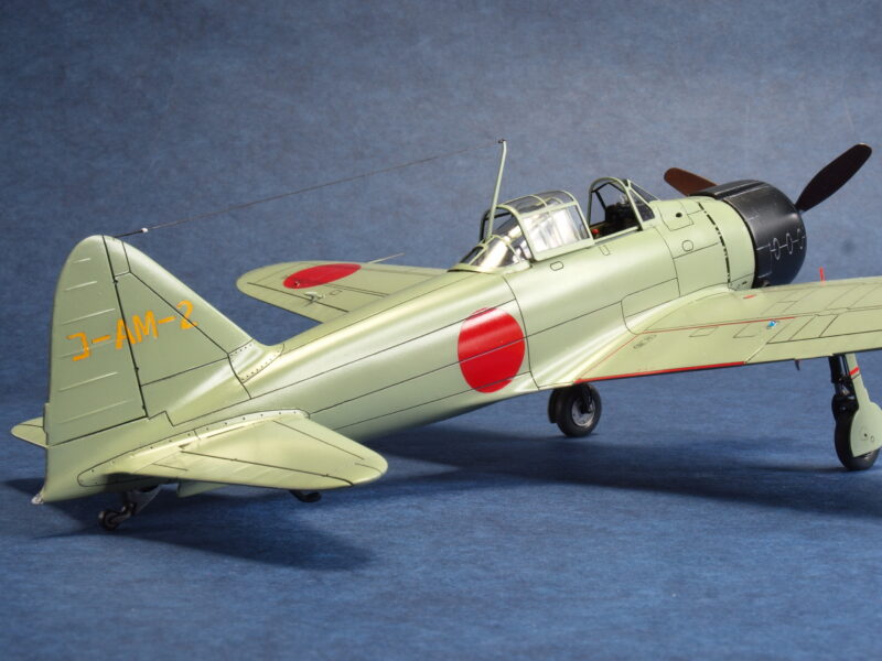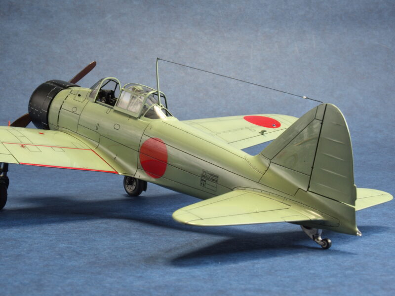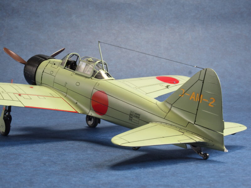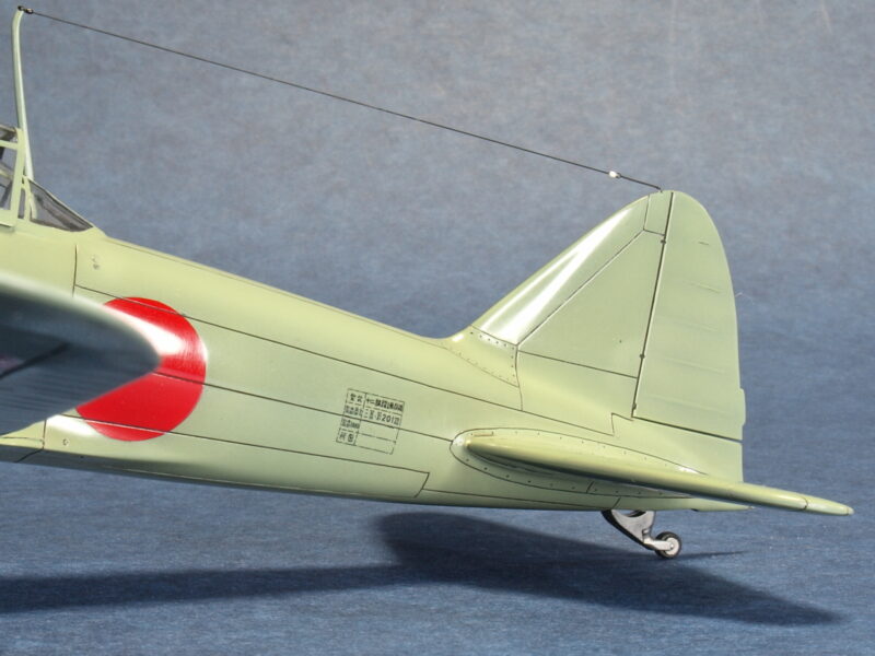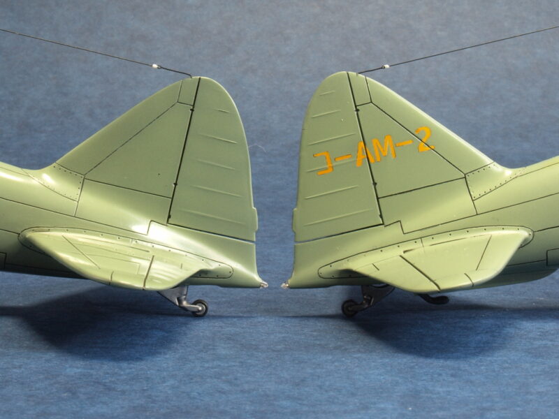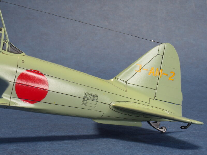 試作二号機は、試作一号機の飛行試験結果から垂直尾翼の高さ(面積)を若干大きくしているため、試作一号機のキット垂直尾翼の高さを減じる改修にて違いを再現しています。尚、初飛行時の試作一号機は、海軍領収前なので、垂直尾翼の機体コード「コ-AM-1」は記載されていなかったとのこと。最近の考証情報で、垂直尾翼の機体コードの塗装色は、赤色でなく、黄橙色であったとのこと。