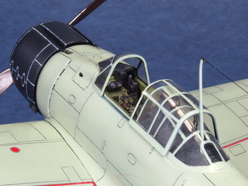 キットの操縦室内パーツは、時代を感じさせる簡素な状態なので、社外アフターパーツのエッチングパーツを貼り込み近代化ディテール・アップを図っています。また、本作品では、試作二号機のみ、九八式射爆照準器を実装し、試一号機は、ダミーウエイト装備として仕上げています。尚、九八式射爆照準器は、キット・パーツをベースにディテールアップを行っています。