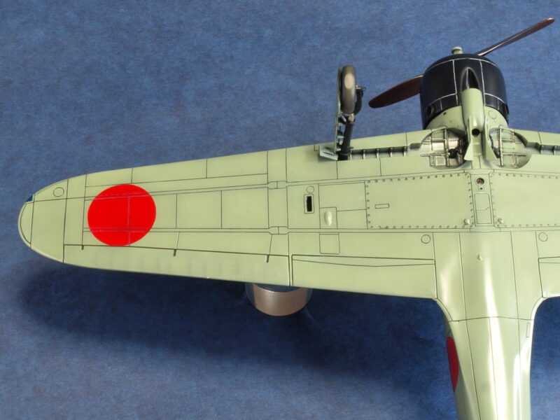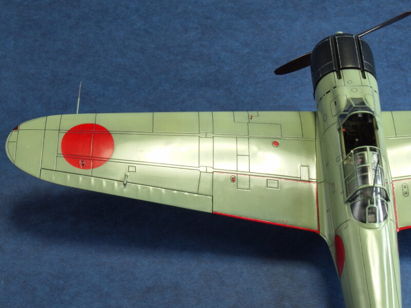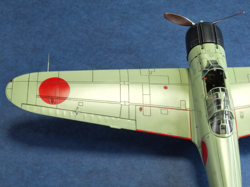 主翼では、試作一号機と試作二号機のみに設けられた上面の点検パネルをスジボリ追加にて再現。実機におけるこのパネルは、主翼20mm機銃の弾道調整に腔軸を通視する「のぞき窓」として使用されたとのこと。あと、翼端灯、編隊灯や尾灯部分は、透明パーツにて自作し追加しています。