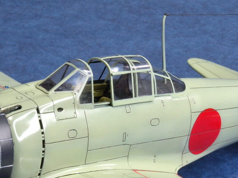 ハセガワ48の零戦キット・シリーズの風防は共通形状で、第一、第二、第三風防の3ピースに分割されたパーツのみで構成されており、第二風防の開状態と閉状態を選べる形状なので、第二風防のスライド・レールを再現する工作によりレール機能を持たせ、第二風防の両底面の前方部分にレール軸を仕込むことで、第二風防のスライド可動が出来る様に改修しています。また、第二風防部分のディテール追加として、室内側のコの字引き手と機体外部からアクセスする「ロック外し」用のつまみ(涙滴状)を自作し追加設置しています。