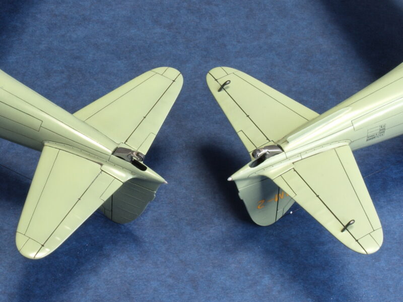 また、初飛行時の試作一号機には機体胴体下部のヒレは未設置であり、試作二号機には、試作一号機の飛行試験結果から昇降舵の振動を抑える目的で昇降舵下面に腕木式のマスバランスが設けられました。腕木式のマスバランスは、キット付属の余剰パーツ(21型の主翼用)を少し小さく加工し流用して取り付けています。