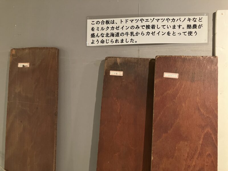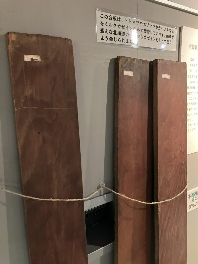そしてこれが、木製部分に使われた合板の実物。複数の薄い板を専用の接着剤(牛乳成分から抽出されたガゼイン)で重ねて接着して製造された大判の板材。現代のベニヤ板と同じ構造の木材。当時は、航空機にも使える強力な木工用の接着剤が無かったため、急遽開発されたものの、接着不良等が生じ品質が安定しなかったとのこと。