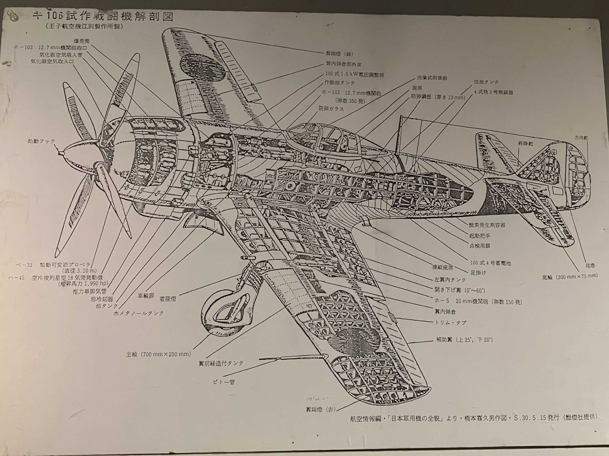 木製戦闘機キ106の解剖図です。製作では、この図も参考に分析しながら、外装の木製部分と金属部分とを判別しました。