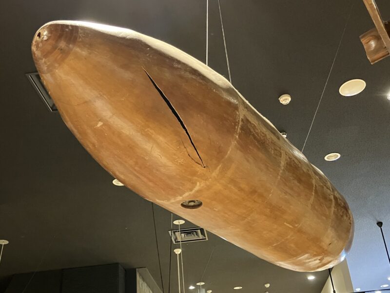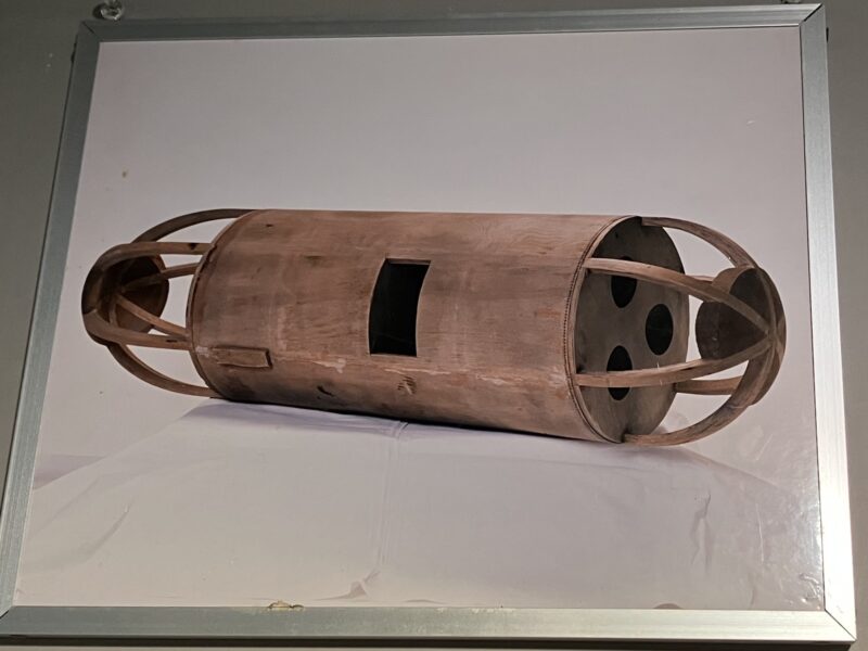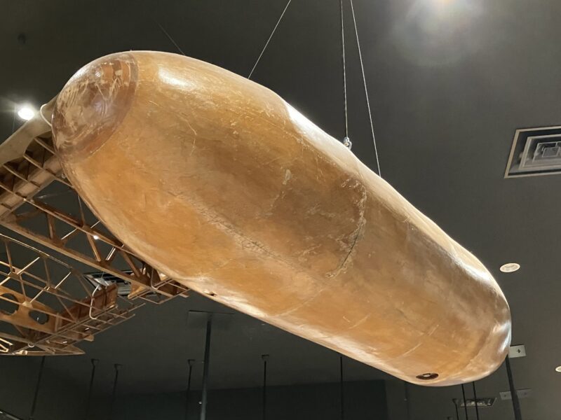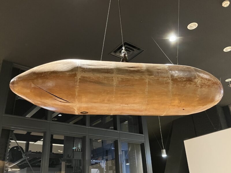 そしてこれが、北海道博物館に展示されている落下式増槽。合板を張り合わせたもので、主翼と同じく当時の北海道工業試験場で試作したものです。経年劣化でしょうか、表面に割れが生じています。