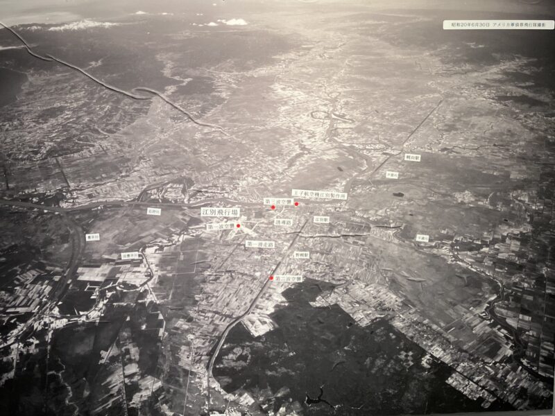 戦時中当時の航空写真(米軍撮影)です。王子航空機(江別工場)に併設して江別飛行場が整備されました。米軍による空襲は、ここにも行われています。