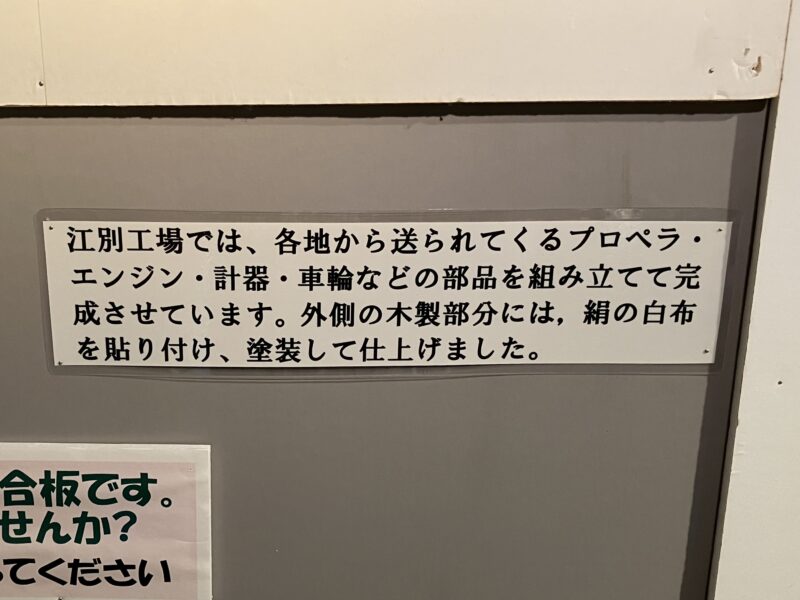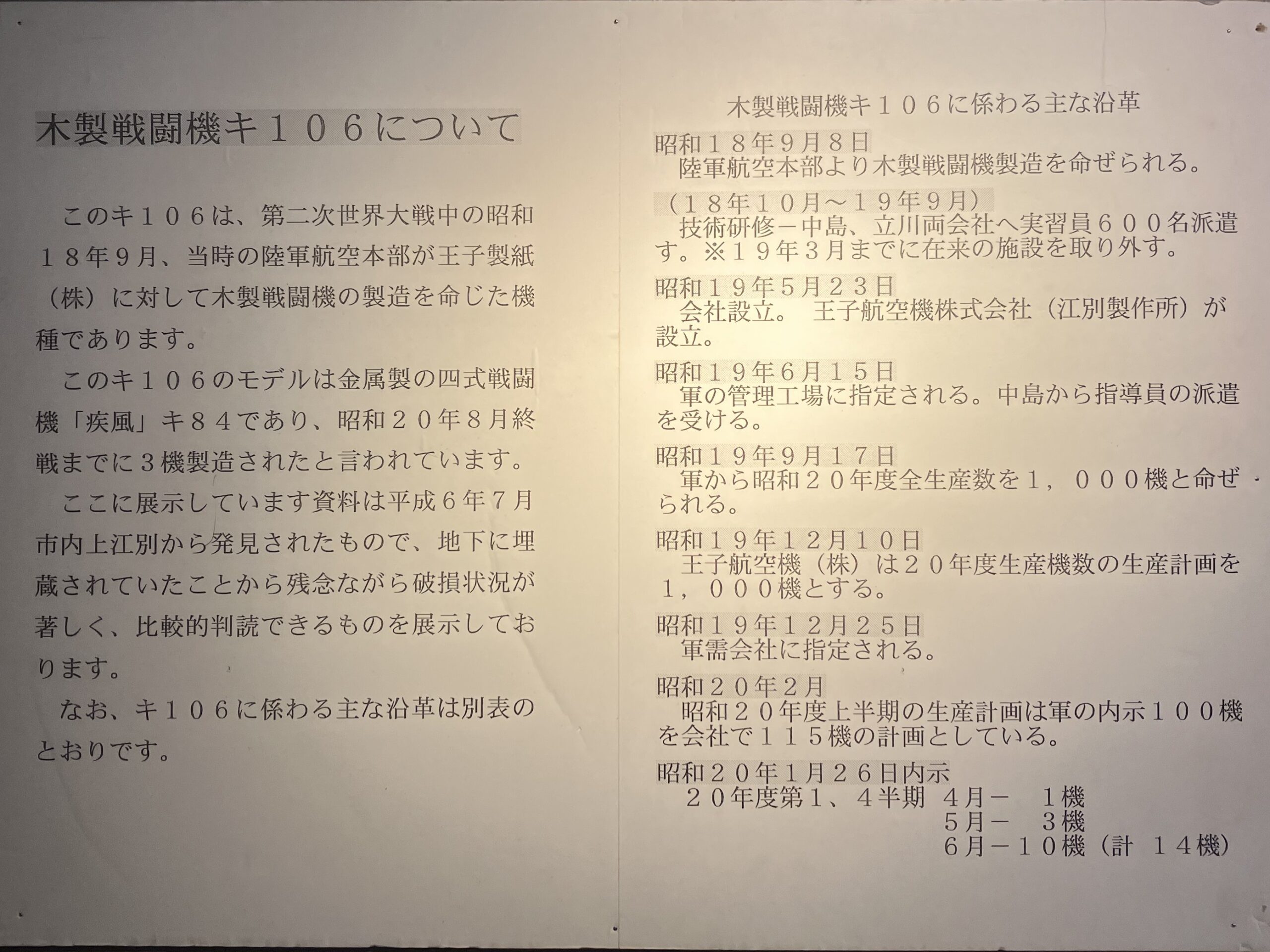 木製戦闘機キ106についての紹介説明パネルです。キ106は、木材産地の国内各地で分散製造される計画で、立川飛行機の試作(立川市)・生産機製造(岡山県)に加え呉羽航空機(富山県)、王子航空機(北海道)や高山航空工業(岐阜県)においても、生産機の製造が計画されました。尚、北海道の王子航空機は、江別市を生産拠点としていました。