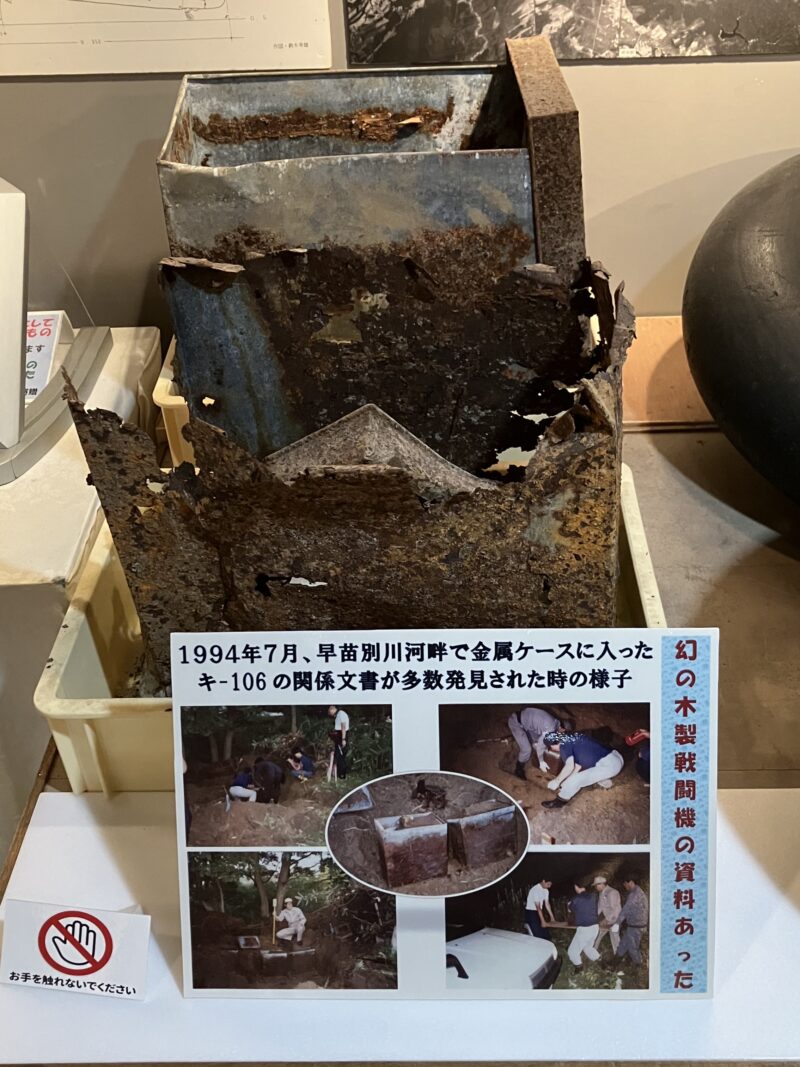 キ106戦闘機に関する戦時中の図面資料を入れて地中に埋めてあった金属ケース。金属ケースの腐食による浸水により、資料の一部は判別不能となりましたが、この資料のお陰でキ106に関する開発や生産記録の経緯や機体の設計図等の概要を知ることが出来る様なりました。チョットした歴史的発見!。