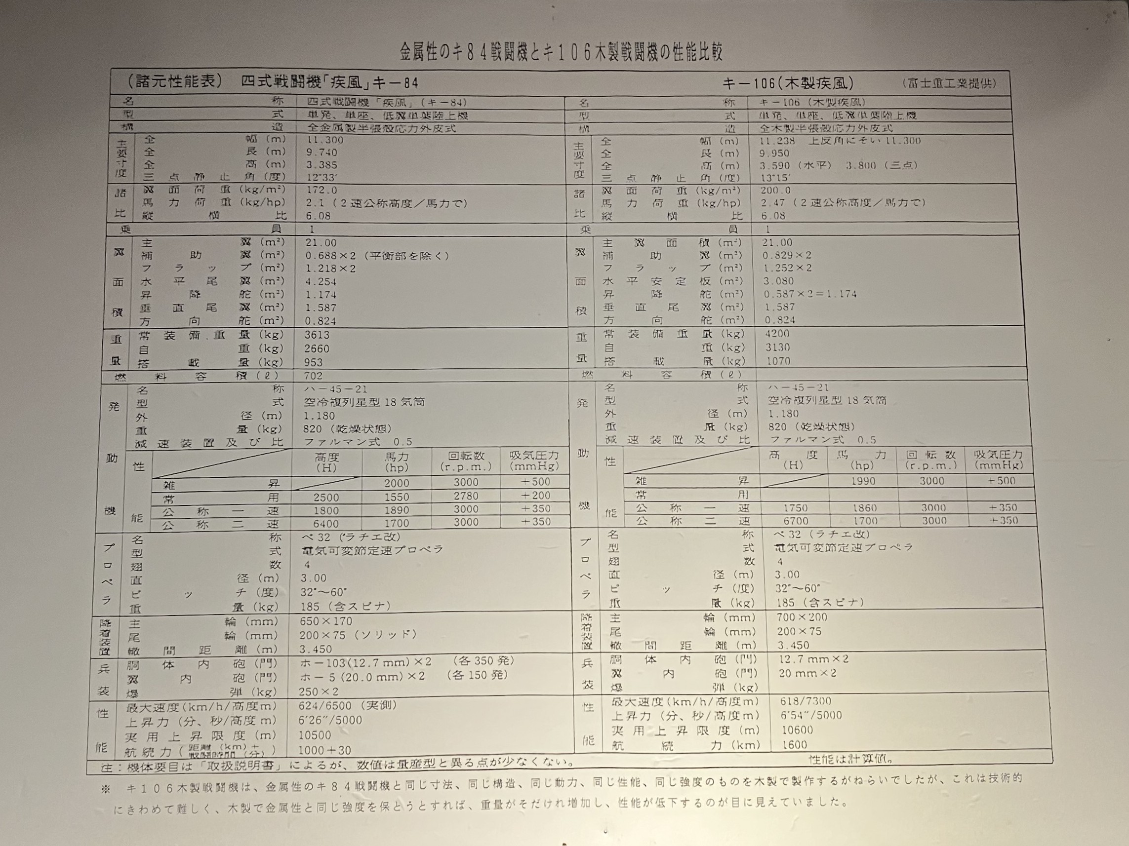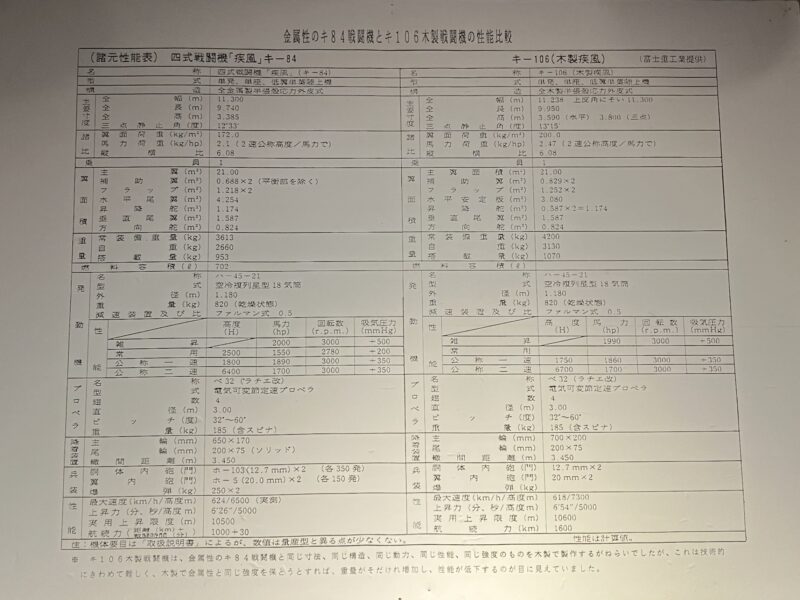 四式戦「疾風」と木製戦闘機キ106との比較性能表です。製作時の資料書籍にも同じデータが掲載されていましたので、出典元が同じみたいです。製作時は、このデータを基に見え掛かりとなる機体全長や主輪径等の寸法数値で異なる部分をピックアップしました。