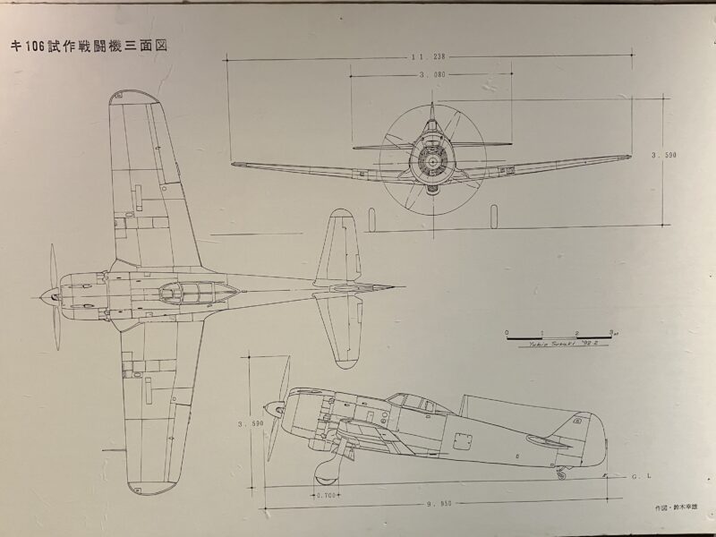 木製戦闘機キ106の三面図です。発掘された当時の資料を基に再現されたとのこと。水平尾翼の取付け高さや主翼根本部分の膨らみ形状、主脚カバー形状等で、四式戦「疾風」と大きく異なる部位がよくわかります。模型製作に必須の資料。