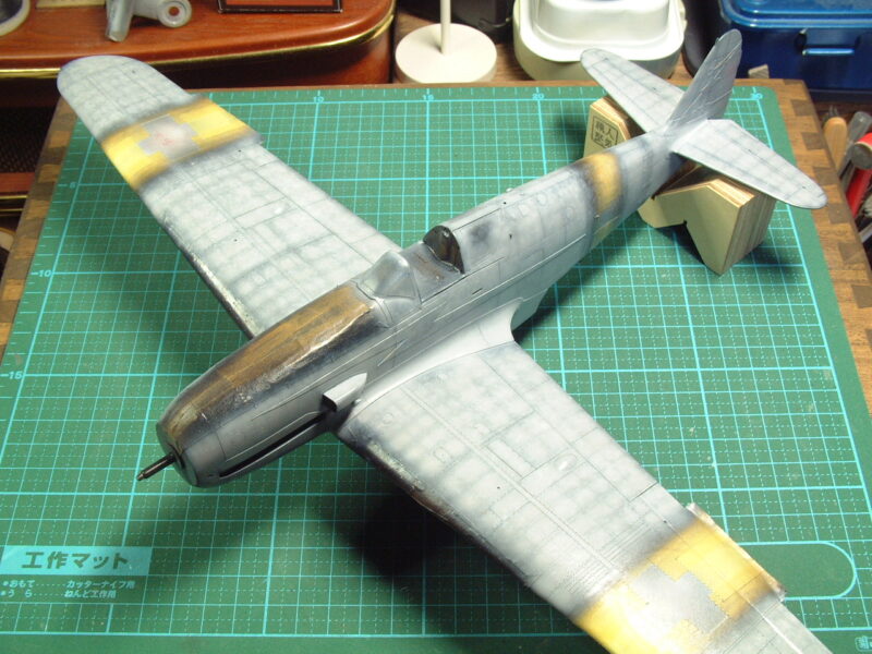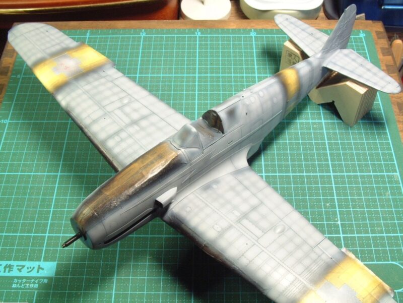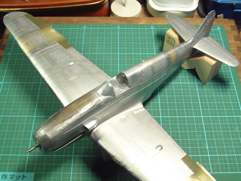 味方識別帯、国籍章、部隊マークやパーソナルマーク類の塗装を終え、マスキングまで完了したら、機体全体塗装の工程に入ります。今回の製作機体は、無塗装の全面ジュラルミン素地ですが、実機写真を見ると何度か塗装の塗りはがしが行われた形跡があり、表面が荒れた金属感のある雰囲気を持ったシルバー色塗装を目指します。
