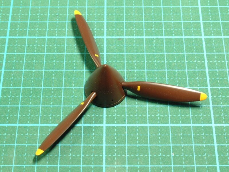 小物類の塗装仕上げの残りで、プロペラ・スピナーの仕上げです。今回の製作機体は、244戦隊所属機なので、プロペラ先端の警戒帯(橙黄色)は、標準機の帯状でなく、先端全部に塗装されています。実機資料本では、実機プロペラ先端50mmの幅で塗装されていたとの記述がありますが、違和感があり、当時の実機写真から割り出すと先端100mm幅程度ありましたので、後者の値を採用(1/32換算で3mm)しています。