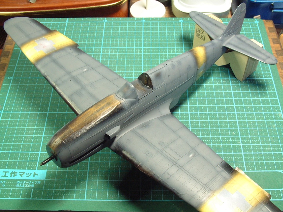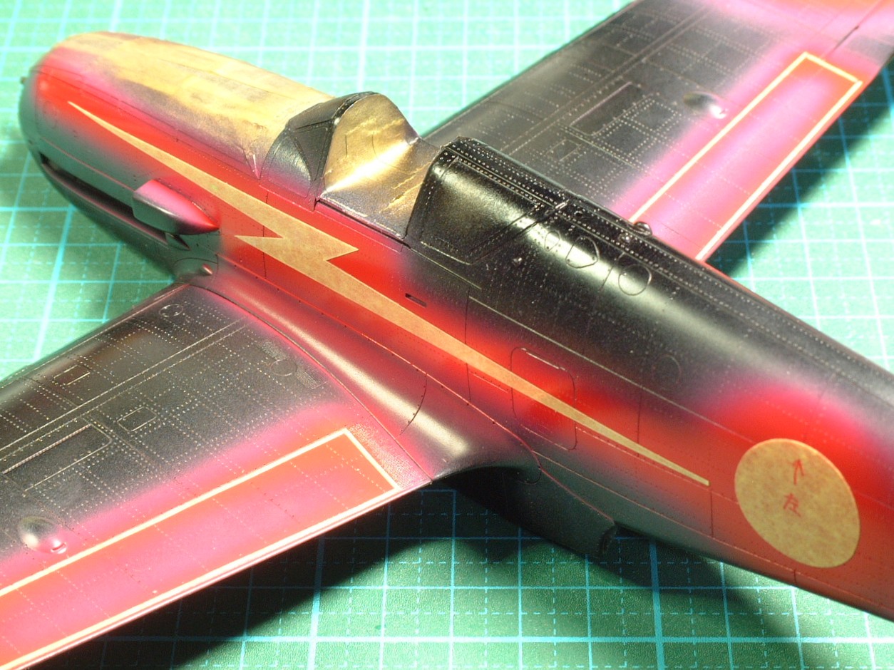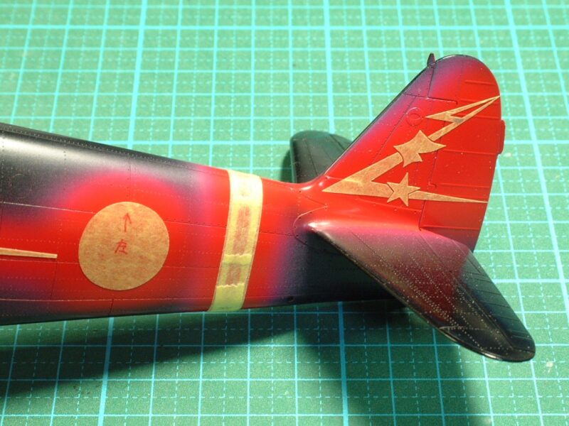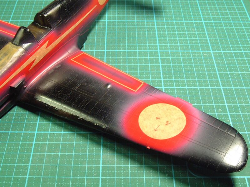 下地塗装のシャドー色の上に、まず主翼前縁部の味方識別帯(橙黄色)を吹いて、マスキングします。次に国籍章、部隊マークやパーソナルマーク類の赤色を吹いてマスキングします。
