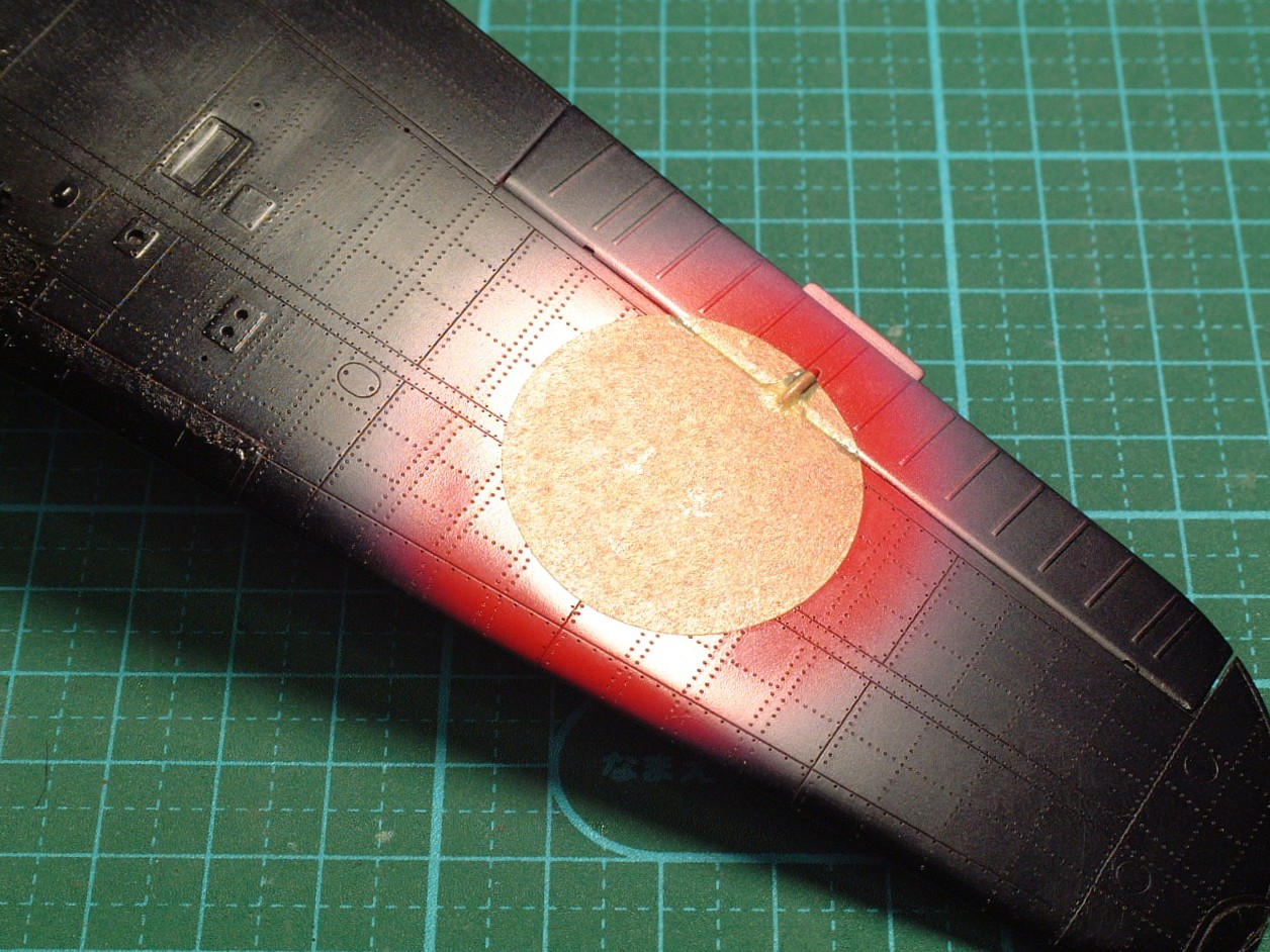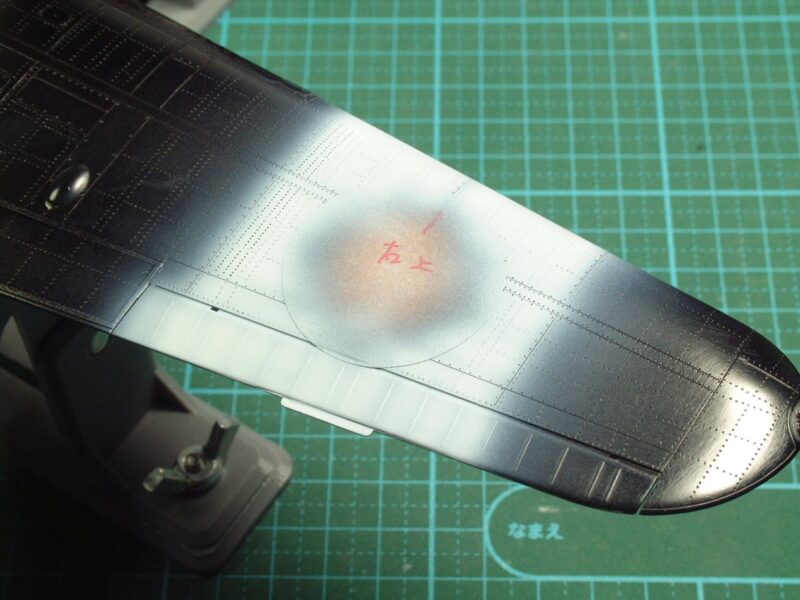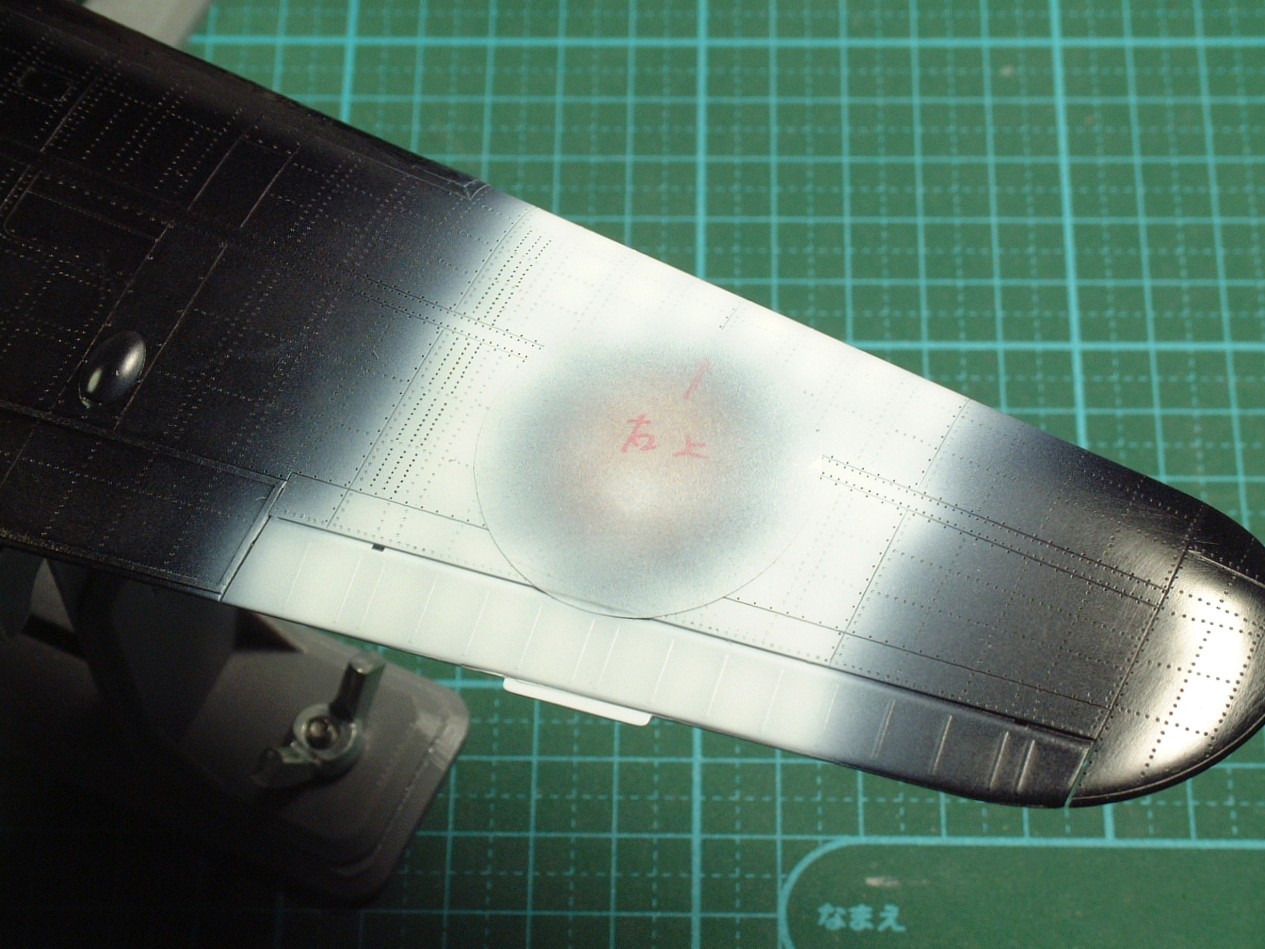 主翼下面の国籍章(日の丸)部分のマスキングは、補助翼操作用の突起部に掛かりますので、密着する様にマスキングシートに切り込みを入れて圧接し、出来た隙間にマスキングゾルを塗ってマスキング補修します。