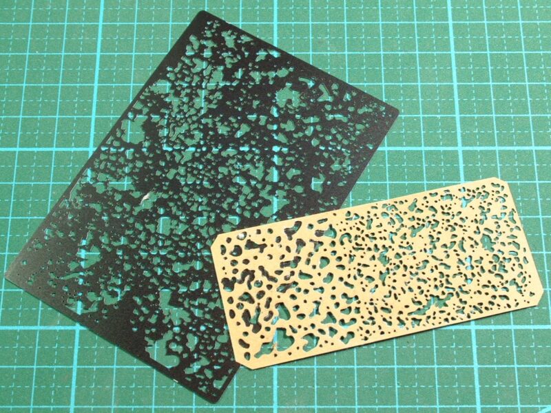 更に、ハイライト色としてホワイト色を塗装用ステンシル・シート(虫食い状)を用いて吹き重ねて、ランダムなムラを作り荒れた金属表面の表現とします。因みに今回使用したのは、タミヤ・エナメルカラー:ホワイト X-2です。これにて下地色塗装は完了です。