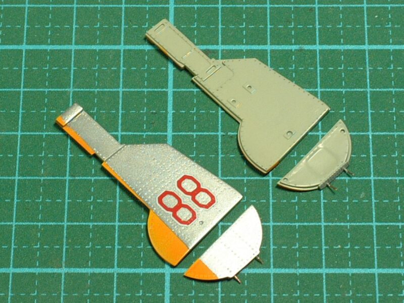 機体全体の塗装が完了したら、部分塗装に入ります。今回の製作機体の主翼の補助翼上面には、以前の迷彩塗装(濃緑色)の除去残しがあるためマスキングの後、濃緑色を吹きます。そして主翼の補助翼下面、水平尾翼の動翼部、及び垂直尾翼の動翼部は、羽布張りドープの上にシルバー色塗装が施されているので、機体のジュラルミンと色味が異なるマット感のあるシルバーを吹いています。因みに今回使用した濃緑色は、Mr.カラー:濃緑色(川崎系)No.130、シルバー色は、タミヤカラー(ラッカー塗料):シルバー LP-11です。